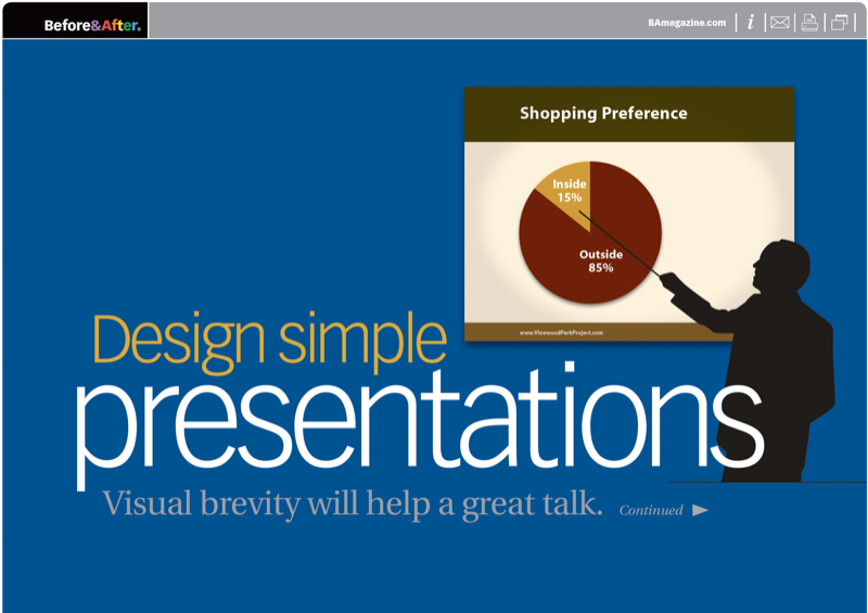 Do you have a speech to give? Presentation software like PowerPoint or Keynote makes it easy to add slides, which can include your company logo and colors, headlines, bullet points, photos, video clips, charts and more. Transitions can be made with cinematic dissolves, wipes and other effects. All of this is helpful. But the most important thing to remember is that you, not your slides, are the show. This 15-page article from issue 43 of Before&After Magazine shows you four basics of creating slides that don’t make a documentary but instead supplement your story with easy-to-remember points.