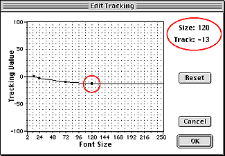 You can always adjust the tracking of a selected paragraph or a headline for overall tighter or looser spacing, but wouldn’t it be nice if you could make this adjustment just once and be done with it? There’s a way to set this up, and once again, it involves the free Kern/Track Editor XTensions. Assume that you’re going to use ITC Officina Sans Book throughout a big job you’re working on. In some cases, you’re using this font for callouts at 14-point size, but you’re also using the font in 24-point, 72-point, and even 120-point headlines. At 14 point, the tracking looks okay, but as the size increases, the font seems to fall apart as the intercharacter spacing gets looser and looser. Of course, you could set tracking values in your style sheets, but it will be better to make a permanent adjustment to the way QuarkXPress tracks this font at varying sizes. Open a new QuarkXPress document and set a line of type in 120-point ITC Officina Sans Book or a similar font you have available. Access the controls for the font’s tracking values by choosing Utilities > Tracking Edit. In the Tracking Edit dialog box, scroll through the list of fonts until you find your font, and then click the Edit button. The resulting Edit Tracking dialog box shows a graph with the vertical axis representing positive and negative tracking values, and the horizontal axis representing font sizes. If no one has ever changed the tracking settings for this font, you’ll see the default setting, which is a straight horizontal line running along the zero point. By experimenting with manual track settings, you’ve determined that you’d like this font to set with no tracking up to 14 points, you’d like a -3 tracking at 24 points, a -10 setting at 72 points, and a -13 setting at 120 points. So, with these figures in mind, click on the horizontal line at the 14-point size, to place a point at exactly 0 units. You can judge the approximate unit value and point size by gauging the movement of the point against the vertical and horizontal axes of the graph, but when you hold down the mouse button, you can also see the exact values in the upper-right-hand area of the dialog box.