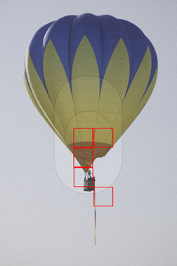 Figure 8: Red indicators illuminate the part of the image that is critically-focused (simulation).Both the Nikon and Canon cameras have large, high-capacity batteries. The Canon battery seemed to last longer than the Nikon’s, though that may have been an issue of age rather than quality. I like Canon’s battery charger better, as it can charge two batteries simultaneously.