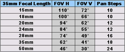 The number of steps you’ll need for a panorama depends on the focal length of the lens you use, as shown in this table. FOV is field of view, the angle of the image captured by the lens. FOV H is Field of View Horizontal (when the camera is held horizontally); FOV V is Field of View Vertical (when the camera is held horizontally). These FOV angles are switched when the camera is mounted vertically for panoramic imaging.