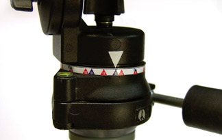 I created a handmade index around the rotating base of my tripod head for QTVR use. When making a panoramic image, I move the pointer (a triangle of white tape) from one number to the next. Note: red markings indicate 1/16 rotation while blue markings indicate 1/12 of the rotation.
