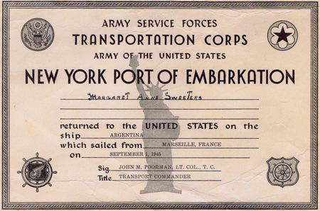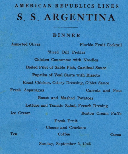 My mother was very proud of her military service; she tended to the wounded in England and France. She saved the menu from her return voyage home on the S.S. Argentina (she went over on the Queen Mary) and a couple of mementos from her brief stay in New York City. Aside from her war experience, my mother traveled very little.
