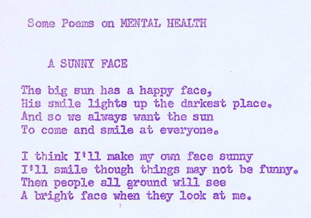 Thank God we’ve come a bit farther than the days when the field of “mental health” was about bucking up and putting a smile on your face. But that was typical of my mom and I imagine she handed out plenty copies of this poem: