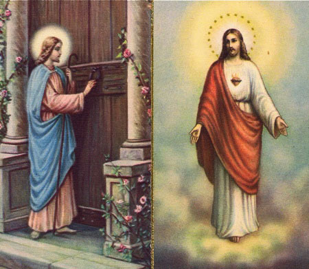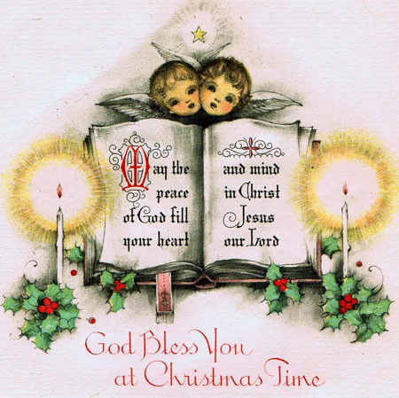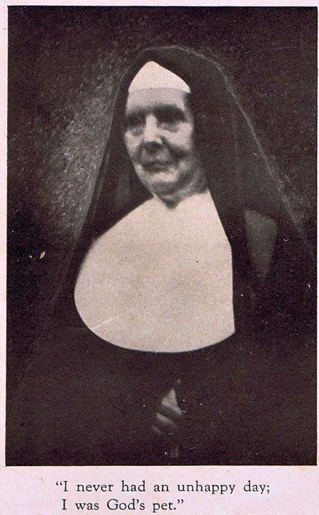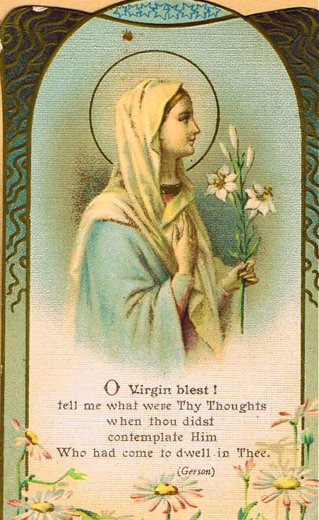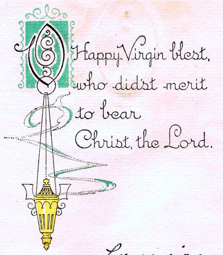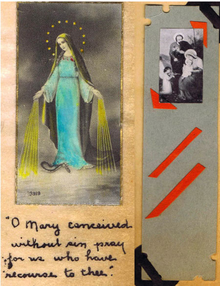 Looking through the scrapbook made me feel sorry for my mom. She was sent away for high school to St. Mary’s Academy, a Catholic all-girls boarding school, where she worked in the cafeteria to pay her tuition. Here is a picture of Sister Laurentia, who, we discover from the caption, had a special relationship with God. That is followed by several of the holy cards my mother also kept in her scrapbook.