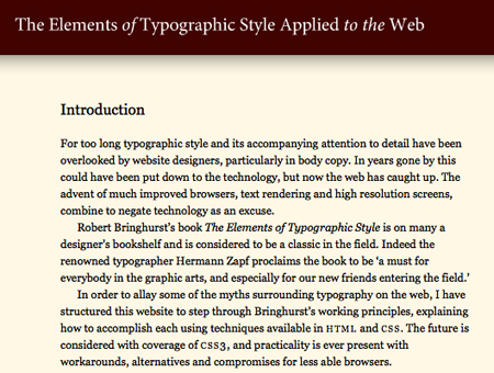 Robert Bringhurst’s book The Elements of Typographic Style is on many a designer’s bookshelf and is considered to be a classic in the field. This site, conceived by Richard Rutter, applies Bringhurst’s principles to the Web.