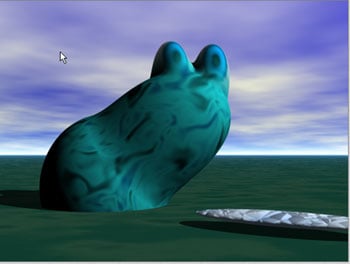 Figure 7: …but when the scene is rendered, the metaballs come alive. (Note the frog tongue metaball lying on the ground.)