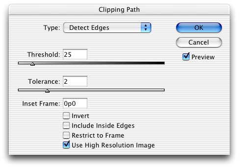 Clipping Path dialog box. If, however, you’ve sworn off drawing clipping paths-but the image is on a pretty clean white background-you can set the Type popup menu to Detect Edges. This is trickier, because you have to adjust the Threshold and Tolerance settings until you “knock out” the background without erasing too much of the image itself. I almost never use Detect Edges to build a real clipping path (it’s just too blunt an instrument), but it works well for this technique because a varnish or emboss plate rarely needs to be precise. Either way, turn on the Preview checkbox in the Clipping Path dialog box to make sure the clipping path looks right on screen before pressing OK.