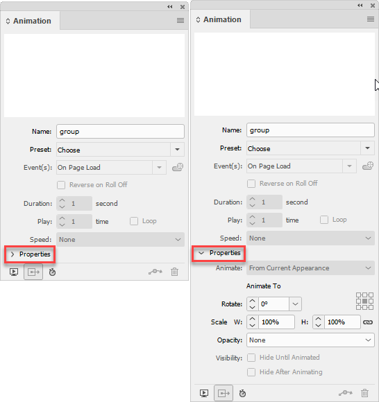 We need to set the animation for this group so that when the button is tapped, the group will slide in from the bottom of the page. If it’s not already open, open the Animation panel, and reveal the Properties portion of the panel (Figure 7).