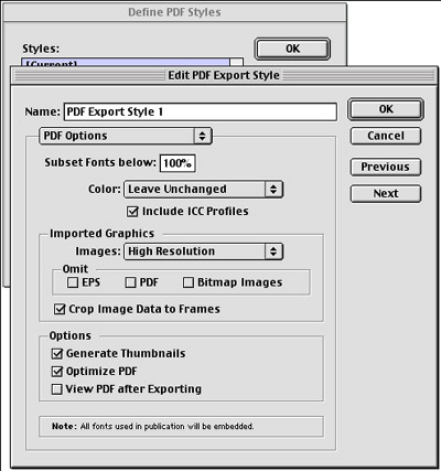 OPTIONS: Check Generate Thumbnails, Optimize PDF. Don’t check View PDF after Exporting, since it opens the PDF file in Acrobat Reader and you’ll want to open and view it using the full version of Acrobat for further editing.COMPRESSION POPUP MENU OPTIONS