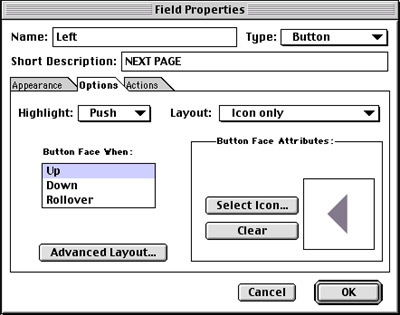 Figure 6: Using the Acrobat 4.05 Form Tool opens a dialog box that allows the creation of interactive buttons. - From the File menu, select Document Info and establish settings in the General and Open Info dialog boxes. The Open Info dialog box settings are especially important: This is where you establish that viewers will see a full screen slide show without the distracting Acrobat Menu and Toolbar controls.