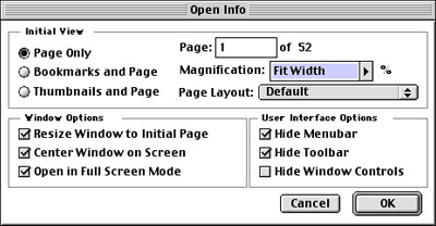Figure 7: The Acrobat 4.05 Open Info dialog box is where full screen slide show settings are established (Magnification: Fit Width), but other controls also appear in the General Preferences dialog box that is accessible from the FileGENERAL INFO
