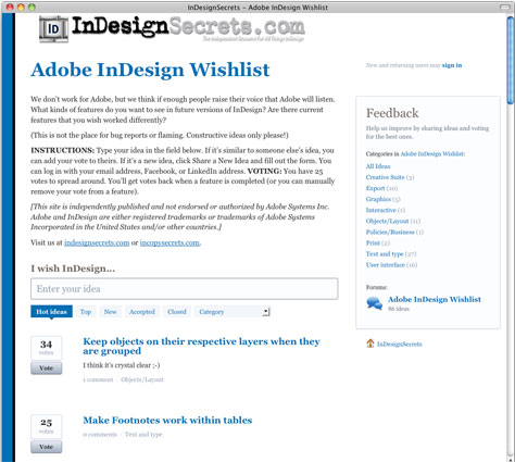 The Adobe InDesign Wishlist is from InDesignSecrets.com, an independent entity helmed by Anne-Marie Concepcion and David Blatner. While they aren’t on Adobe’s payroll, they do have the ear of the InDesign team.