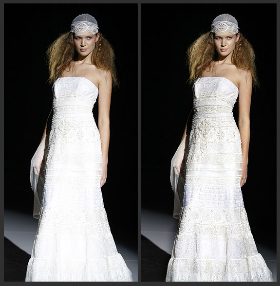 In this first example, the editors at Wedding Style magazine wished to include this image of a YolanCris gown in the regularly featured Bridal Runaway spread. In its original form, with the loss of all detail of the gown’s delicate eyelet and embroidery work, it was unsuitable for publication. Reproduced as is, it would not have served the bridal designer as a flattering representation of her work, nor would it have been useful to the magazine reader searching for her dream wedding gown. Moreover, from a magazine production standpoint, the image did not meet the quality standards I had established for the publication. (At the time, I was the Production/Imaging Director for Wedding Style magazine.)