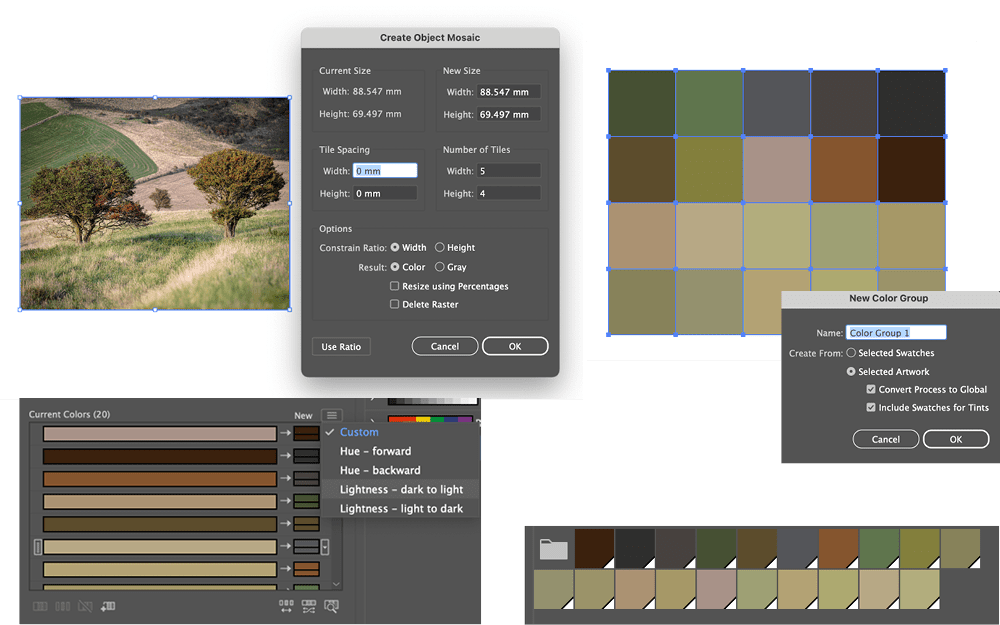 To create a custom palette from an image, embed (rather than link) the image. Next, choose Object > Create Object Mosaic. From the resulting dialog box, you can choose the number of tiles you want (Figure 11). With the image now converted to an abstract grid of colors, click New Color Group on the bottom of the Swatches panel. Just as in InDesign, reordering your colors by luminance or hue isn’t as straightforward as it could be. You’ll either need to reapply your colors to the original swatches or apply them to another piece of artwork, so with artwork selected, double-click the folder icon of the color group to go to Recolor Artwork. Click the New menu above the column of the new colors and choose your preferred sort mode. Now choose New Color Group from the top right of the dialog.