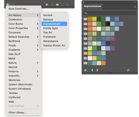Another source of inspiration from within Illustrator are its color libraries—and I’m talking old fashioned libraries rather than CC Libraries here. There is a good selection of themed color libraries (probably created by an intern over a series of rainy afternoons circa 1998) that are often overlooked, but can provide a launchpad for your own color palettes (Figure 12).