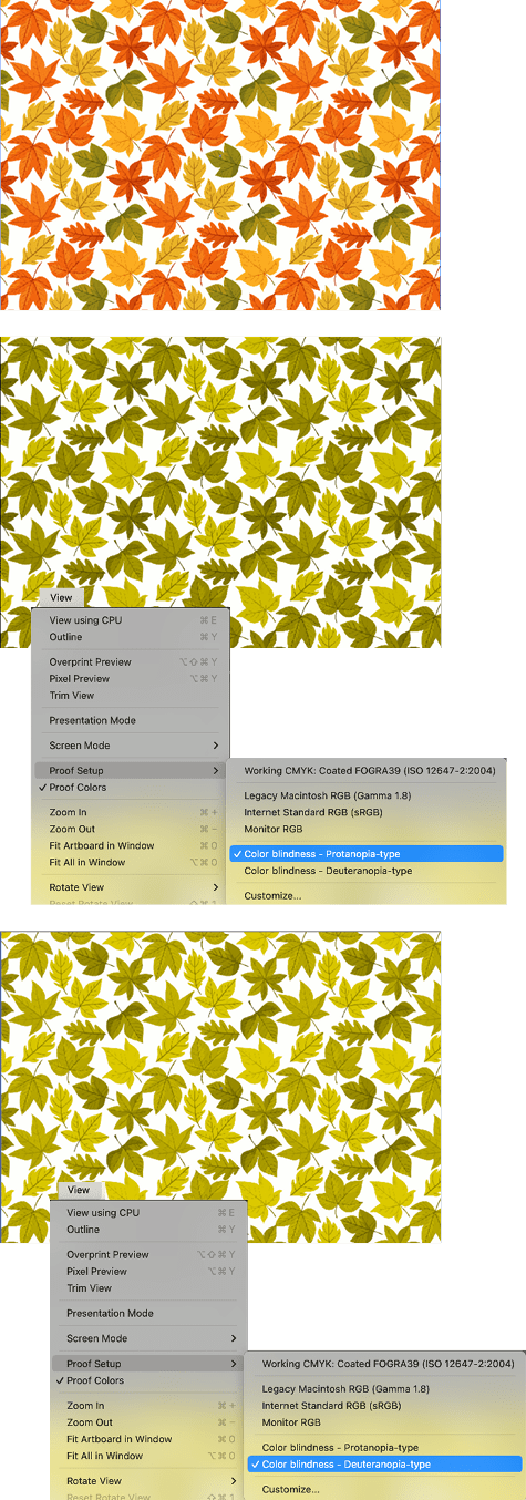 As well as choosing colors that are visually pleasing, we also want to make sure they are inclusive and accessible to the widest possible audience. Illustrator and Photoshop both have proofing options that simulate how your designs will look to individuals with color blindness (Figure 16). For some reason, InDesign lacks this option, even though its proofing tools are otherwise the same.