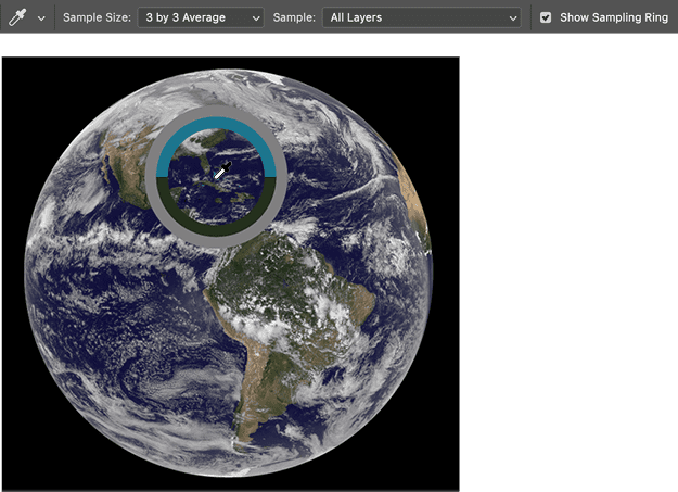 While all applications have an Eyedropper, the Photoshop version of the tool offers the most options. You can choose which layer(s) you’re sampling from as well as set the sample size from a single pixel to averages as high as 101×101 pixels for large images, where a single pixel might be unrepresentative. You can also drag the Eyedropper outside the Photoshop window (so long as your workspace is not in an Application Frame), to sample colors from anywhere on your desktop. While the Eyedropper is active, the Sampling Ring shows the new color above and the current color below, surrounded by a ring of neutral gray, making it easier to evaluate your choices (Figure 2).