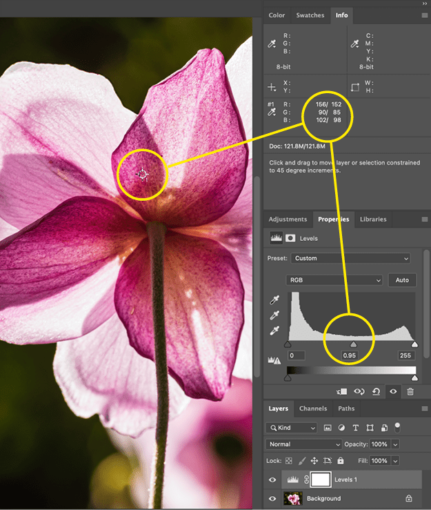 Working in conjunction with the Eyedropper, the Info panel gives a breakdown of the colors you’re sampling, offering real-time feedback in all color modes: RGB, CMYK, HSB, Lab, or Web hex values at the cursor’s position. Hold Shift when using the Eyedropper to toggle to the Color Sample tool, letting you add up to four fixed color sample points. These can be invaluable when adjusting an image, as you can compare the values of the Current Color and the New Color during adjustments like color correction or retouching (Figure 3).