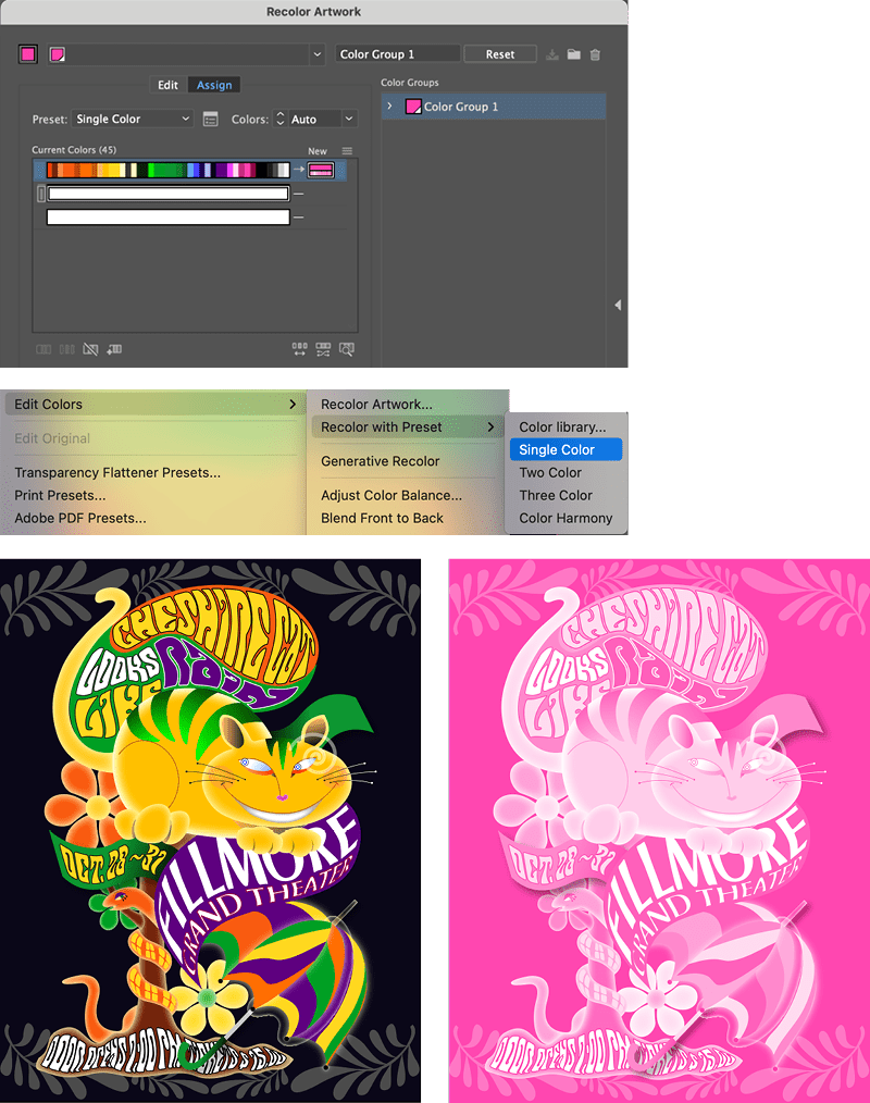 Figure 6. Recoloring artwork in Illustrator using the Single Color preset