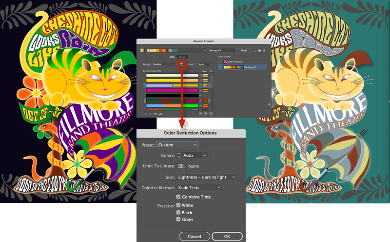 This is especially useful if the artwork needs to be reproduced with brand colors or with a radically simplified color palette. To control how the colors are remapped, you can order them by hue or lightness in the New menu, as well as drag current colors onto new colors. There’s also the option to preserve blacks, whites, or grays (Figure 8). You can also use Generative Recolor to recolor artwork by using text prompts to describe the color palette you’re after.
