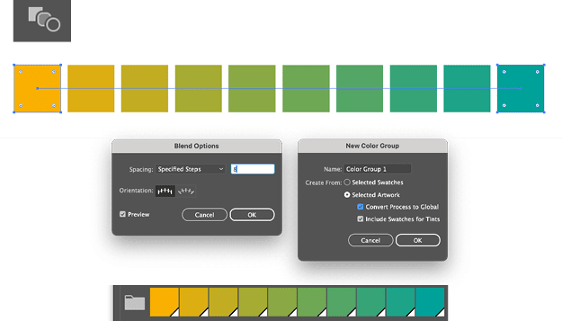 For an old school approach to creating color palettes, use the Blend tool. Create your start and end colors, apply them to simple objects, then create a stepped blend between them. You can blend between multiple objects, but for the example in Figure 9 I kept it simple.