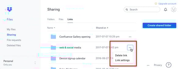 The Sharing section (Figure 5) lets you manage the folders, files, and links that you’ve shared and that others have shared with you.