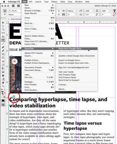 Fortunately, this workflow gap has been filled in by an independent InDesign developer: Em Software comes to the rescue. They make a plug-in called DocsFlow, which adds Google Docs support to InDesign through commands it adds in a File > DocsFlow submenu. Choose File > DocsFlow > Place from Google Docs, sign in to your Google account, and you can then place a Google Doc directly from your Google Drive cloud storage using a standard InDesign link. The Pro version includes two more valuable features: When you edit a placed Google Docs story in an InDesign layout, you can sync those changes back out to the linked Google Docs file in the cloud, and you can also place a Google Sheets spreadsheet.