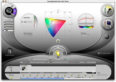 Measuring a light source’s spectrum also lets you predict how spectrally measured color samples will appear under that light source. Eye-One Share includes spectral data for several Pantone color libraries — it’s instructive and sometimes useful to see how the color appearance of both the Pantone colors and any others that you measure changes under different lighting. Last but not least, ProfileMaker Pro 4.1.5 can use light measurements made with Eye-One Share to tailor printer profiles for viewing under that light source — a pretty advanced feature to be sure, but one that’s useful whenever you know the specific lighting under which the print will be displayed.