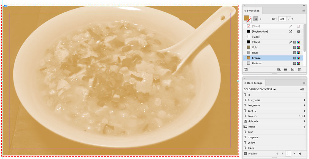It is also possible to incorporate a technique outlined in another article that uses GREP styles to change the color of a background to CMYK values that were entered into the data file. The only difference is that instead of the desired color being set to Screen in the foreground, the variable image frame is now set to Screen in the foreground, with the frame containing the desired color in the fill.