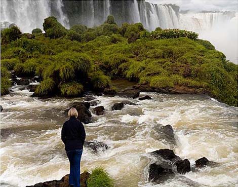 For the waterfall example, I started with the woman standing alongside the river and park bench. I needed to add her to the waterfall scene in a realistic way, so my three primary tasks were placing the woman into the scene, scaling her to fit the placement (both of which were discussed on page 1), and then masking away any extraneous areas from the original photo that would detract from the composite scene.