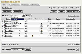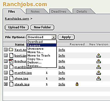 Figure 2: Team members can easily upload and download source files (top). Notice that individual team members can reserve a file — which effectively locks the document and prevents two users from overwriting one another’s edits (close-up, bottom).