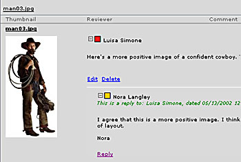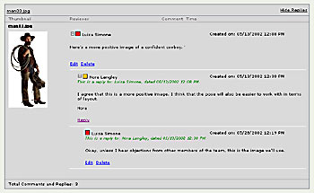 Figure 4: Adobe DesignTeam automatically stores comments from different team members in a single file (top). This makes it easy to view a conversational thread, as shown here (close-up, bottom).
