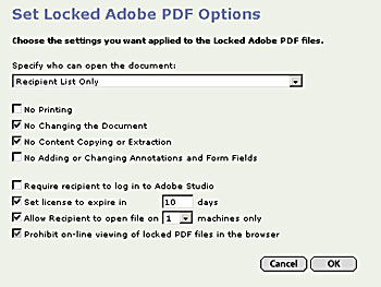 Adobe DesignTeam also takes advantage of the PDF format when the time comes to deliver your files to a third party, such as a service bureau. Basically, the delivery process sets up an FTP site (see figure 5). An email notification instructs the recipient to log onto Adobe DesignTeam in order to download the document. Adobe DesignTeam supports a host of delivery options that ensure the security of your files. For example, all file transfers employ Acrobat 5’s 128-bit encryption. In addition, you can assign an expiration date to the download-permission setting, prevent edits to the Acrobat file, or restrict downloads to a single computer.