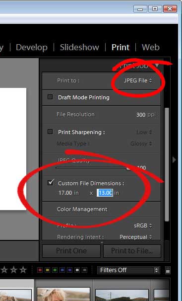 If you choose to print to a JPEG File, you can select the JPEG quality, File Dimensions (although you should have set this already), and Color Profile. Then click Print to File.