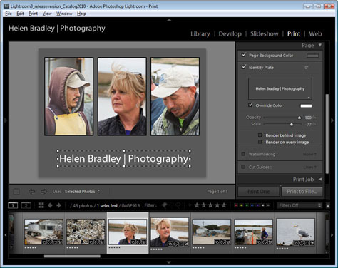 You can add watermarks to your images via the Page panel’s Watermarking option. Select the Watermarking checkbox and click the dropdown list opposite to select a previously created watermark, or click Edit Watermarks to make your own. Unlike an Identity Plate, the placement of the watermark on an image is part of the watermark design itself and is not controlled by any option in the Print module.