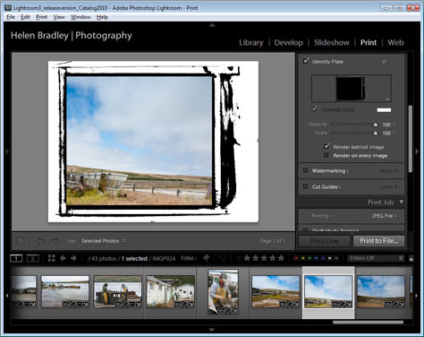 One way to add interesting borders and fancy text effects to your prints is to use a program like Photoshop to create a background, then save it in a format Lightroom can read, such as JPG, TIF, BMP, PNG, or GIF. You can make the image an Identity Plate by choosing Use a Graphical Identity Plate in the Identity Plate editor.