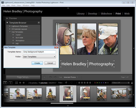 Now that you’ve designed a layout you like, save it as a printing template to use again. First, click the plus sign opposite the Template Browser panel name on the left of the screen and type a name for your template. Click Create and Lightroom will add the new template to the preset list. One handy feature of templates is that paper size information is stored with them. So, if Print to: Printer is enabled in the Print Job panel–or if you have Custom File Dimensions disabled for printing to a JPEG file–you won’t have to set this up each time.