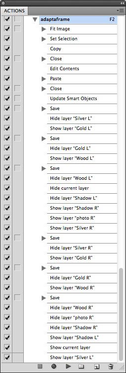 You’ve seen how you can create a picture frame in three different finishes, facing in two different directions, and fill it with a photograph as a Smart Object that will face both ways. Now it’s time to make an action that will let you automatically generate all six different versions of the frame by clicking only one button.