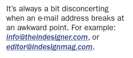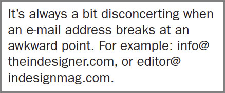 When URLs and e-mail addresses are part of a paragraph in which hyphenation is turned on, you never quite know where those addresses are going to break (Figure 15). Since hyphens are allowed within the syntax of a domain or addressee name, there’s the risk of creating confusion on the reader’s part about whether or not the hyphen that InDesign adds is or is not part of the address. Web addresses are tricky to pin down due to the number of possible sub-domains and subdirectories (for example, forums.adobe.com vs. adobe.com, or theindesigner.com/blog vs. www. theindesigner.com), whether or not the https:// portion is included, what the specific file path is, and so on. Fortunately, e-mail addresses have a very specific syntax that allows them to be defined precisely.