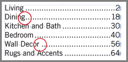 Figure 2. Inconsistent spacing and square dots are just two of the inherent problems with establishing leaders in the tab ruler.