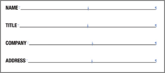 VARIATIONS ON THIS IDEA: The expression above uses just one metacharacter (a special character or combination of characters that describes text) that represents a right-align tab. The space spanned by that tab is filled by the underline style. This same technique can be used with a different character style that applies a solid underline to quickly create precise fill-in lines in a form. The right-align tab will push the line to the right side of the column, and an En Space added just before you insert that right-align tab will create a consistent buffer between that text and the start of the line (Figure 5).
