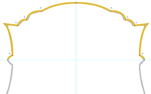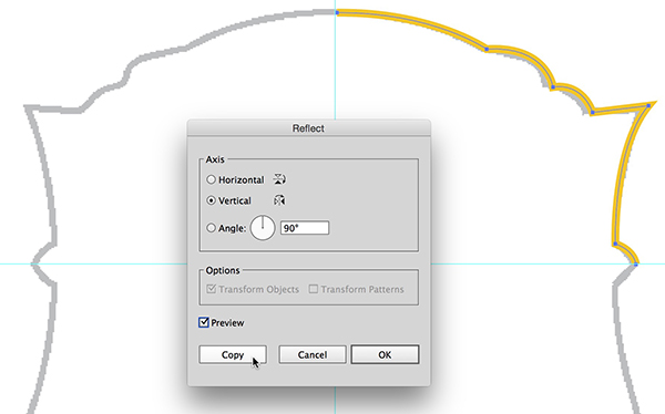 Ideally, the shape we are creating is symmetrical and can be broken in equal halves, or—even better—equal quadrants. Let’s assume our badge is made of the latter, and we will only need to draw one quadrant. Draw out guides delineating the horizontal and vertical centers. Use the Pen tool to create the outline of one of the quadrants, then select the quadrant shape with the Selection tool. Next, choose the Reflect tool by clicking once on it. Hold down Option/Alt while clicking on the edge of the shape’s bounding box that will serve as the axis of the new shape. So, if you have drawn the upper-left quadrant and want to create the upper-right one, you would click on the right edge of the bounding box. Choose the Vertical Axis in the Reflect dialog box, then be sure to click Copy, instead of OK.