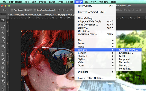 Select the top layer and go to Filter > Pixelate > Color Halftone… Once