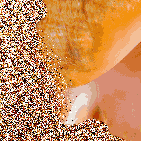 Now, that you’ve defined the water line, there’s one more effect you can do to make the shell sit more realistically on the sand. Currently, no sand is touching the shell at all, so you’ll want to make small overlapping areas of sand. To make the sand overlap the shell, be sure you have the Sand layer active in the Layers palette and then draw a small selection around the bottom-left part of the shell. Now that you have the right position for the sand, turn off the visibility of the Shell layer, Shell Body Shading layer, and the Shadow layer. Now, choose Select > Feather and enter a high Radius setting in the resulting dialog box. We used a setting of 15 for our image. Click OK and press [command][shift]C ([Ctrl][Shift]C in Windows) to copy information from both the Sand and the Water Line layers. Paste the new piece of sand and rename its layer Overlap. Position the Overlap layer above the Shell layer and position the sand so that it overlaps a small portion of the shell body. Now, set the Blending mode of the Overlap layer to Dissolve. This creates a grainy edge effect around the sand allowing it to blend in well with the surroundings without harsh lines or out-of-place feathered effects, as you can see in Figure H. You can repeat this effect in as many areas as is suitable for your particular image.