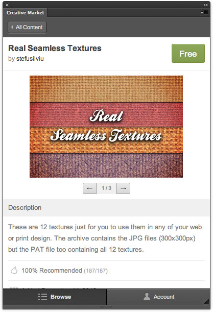You can use the panel to search for specifc items or browse categories like Actions, Brushes, Fonts, Patterns, Textures, and more. You can also enter and view comments and recommendations on each item.