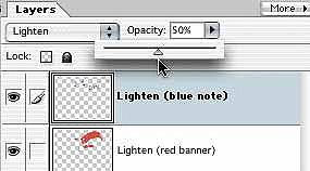 Figure 11: Keeping the blue notes on a layer separate from the bright red allows you to reduce the opacity of the blue separately from the red. To make a selected layer more transparent, move the Opacity slider to the left.