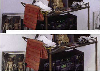 Patching Up Gaps and Holes. After equalizing the color and value of the image and eliminating blurred and double-images, I had another major problem to contend with. Although I had tried very hard to maintain top-to-bottom registration as I photographed the studio wall, I had bobbed up and down just enough to create some gaps in the image. The easiest solution would have been to simply crop the image to the area that was intact. However, that would have meant losing a few paintings that I wanted to keep in the composition. In some instances I could have re-shot the scene, but this would have been more time-consuming than just faking it in those missing areas. Depending on what the image looked like in a problem area, I used different techniques to fill the gaps, including moving copies of portions of the image down or up, stretching regions to fill gaps, and using the Clone Stamp tool to copy portions from another section of the image.
