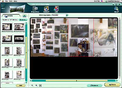 Figure 4: The Olympus CamediaPro navigation interface was the most awkward, paintfully slow. Once you have the correct folder of images chosen (on the left), drag one at a time into the work window and adjust alignment. Zooming tools and a scroll bar make adjustments simple.