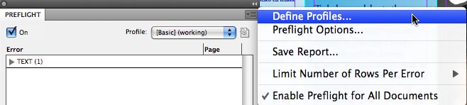 To create a custom preflight profile, open the Preflight dialog (Window > Output > Preflight), and choose Define Profiles from the flyout menu.