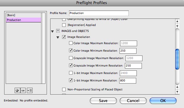 But the key to making Live Preflight useful for your production workflow is to create your own preflight profile. The default [Basic] profile only checks for a few simple things?missing or modified graphics, missing fonts, or overset text.